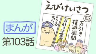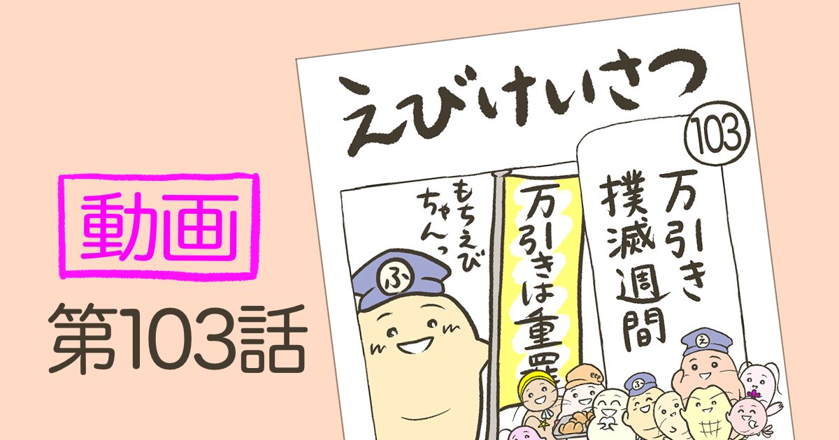 【まんが】第104話 おおみそか上機嫌 まんが 2025.12.312026.01.02 今年も一年ありがとう!いよいよ大晦日、みんなはどんなふうに過ごすのかな? 同じストーリーの動画もあるよ。オリジナルピアノ曲とイラストに動きをつけた約1分の動画だよ↓ 【動画】第104話 おおみそか上機嫌今年ももうすぐ終わるね。大晦日、みんなどんなふうに過ごすのかな?※ 画面を大きくする時は、再生ボタンを押した後、右下の白い四角枠 か2つの斜め矢印 を押してね。同じストーリーのまんが(静止画)もあるよ。ゆっくり見たいときは、こちらを見てね↓... 次の話はこちら↓ 【まんが】第105話 新年のごあいさつ新年あけましておめでとうございます!今年もえびけいさつをどうぞよろしくお願いします!同じストーリーの動画もあるよ。イラスト+オリジナルピアノ曲の紙芝居動画(再生時間:約1分)↓次の話はこちら↓前回の話はこちら↓ 前回の話はこちら↓ 【まんが】第103話 万引き撲滅週間スーパーマーケット店内のパトロール中に遭遇したのは?同じストーリーの動画もあるよ。オリジナルピアノ曲とイラストに動きをつけた約1分の動画だよ↓次の話はこちら↓前回の話はこちら↓