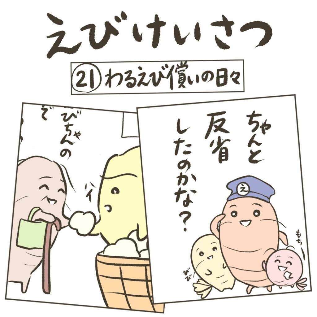 【まんが】第21話 わるえび償いの日々 まんが 2025.10.24 これまでの悪行を償うわるえびちゃん。だんだん気持ちに変化が? 同じストーリーの動画もあるよ。オリジナルピアノ曲とイラストに動きをつけた約1分の動画だよ↓【動画】第21話 わるえび償いの日々 次の話はこちら↓ 【まんが】第22話 限定って欲しくなる限定品って聞くとわくわくするよね?みんなの限定品えびけいさつが守るよ!同じストーリーの動画もあるよ。オリジナルピアノ曲とイラストに動きをつけた約1分の動画だよ↓【動画】第22話 限定品って欲しくなる次の話はこちら↓前回の話はこちら↓ 前回の話はこちら↓ 【まんが】第20話 スーパーマーケットの掟みんな大好きスーパーマーケット。お店の掟を守って楽しく買い物しよう。同じストーリーの動画もあるよ。オリジナルピアノ曲とイラストに動きをつけた約1分の動画だよ↓【動画】第20話 スーパーマーケットの掟次の話はこちら↓前回の話はこちら↓