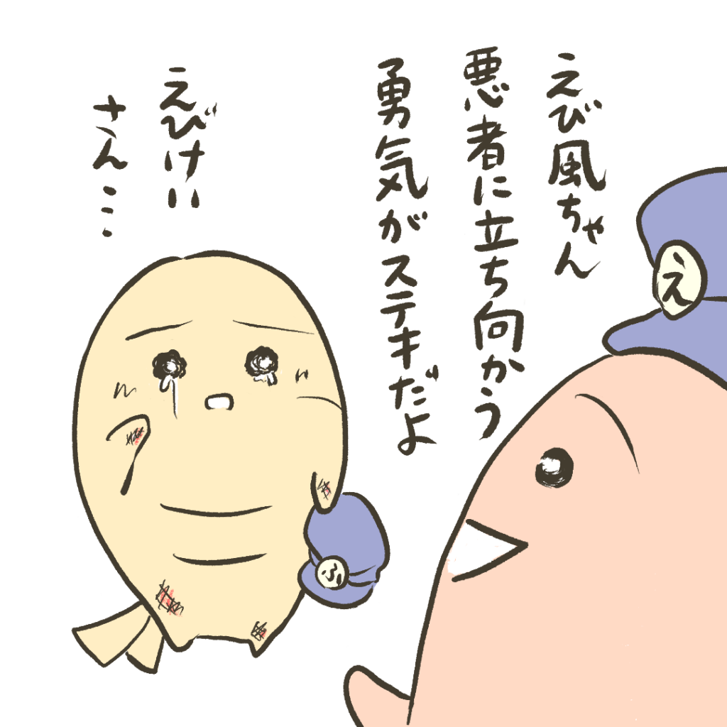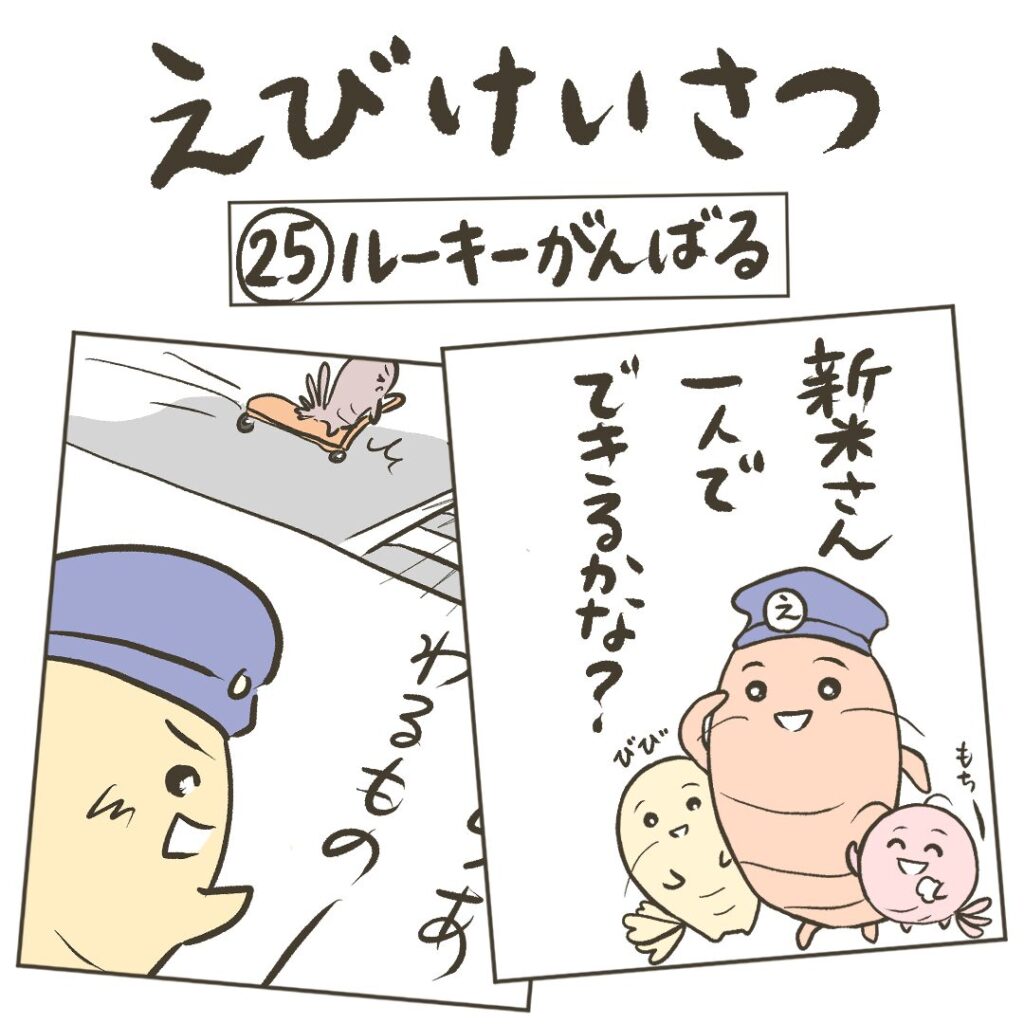 【まんが】第25話 ルーキーがんばる まんが 2025.10.24 新米警官のえび風ちゃん。今日は一人で問題解決できるかな? 同じストーリーの動画もあるよ。オリジナルピアノ曲とイラストに動きをつけた約1分の動画だよ↓【動画】第25話 ルーキーがんばる 次の話はこちら↓ 【まんが】第26話 早く治す方法つらいとき助けを求めてもいいんだよ。寄り添ってくれる人いるよ。同じストーリーの動画もあるよ。オリジナルピアノ曲とイラストに動きをつけた約1分の動画だよ↓【動画】第26話 早く治す方法次の話はこちら↓前回の話はこちら↓ 前回の話はこちら↓ 【まんが】第24話 それは理不尽さっき言ったことと違う…そんな人をだますウソはやめようね。同じストーリーの動画もあるよ。オリジナルピアノ曲とイラストに動きをつけた約1分の動画だよ↓【動画】第24話 それは理不尽次の話はこちら↓前回の話はこちら↓