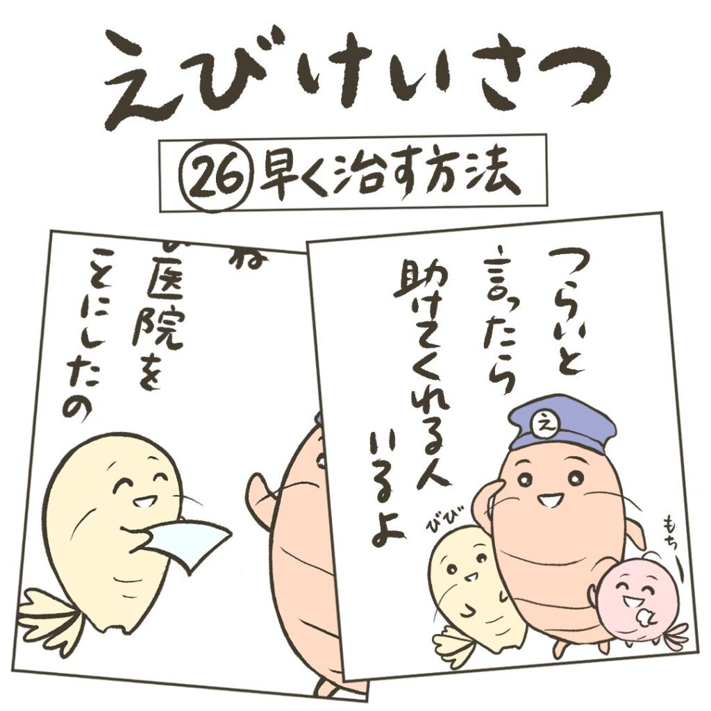 【まんが】第26話 早く治す方法 まんが 2025.10.24 つらいとき助けを求めてもいいんだよ。寄り添ってくれる人いるよ。 同じストーリーの動画もあるよ。オリジナルピアノ曲とイラストに動きをつけた約1分の動画だよ↓【動画】第26話 早く治す方法 次の話はこちら↓ 【まんが】第27話 お見舞いに行くわるえびちゃん療養中。なによりもまずはしっかり体を休めよう。同じストーリーの動画もあるよ。オリジナルピアノ曲とイラストに動きをつけた約1分の動画だよ↓【動画】第27話 お見舞いに行く次の話はこちら↓前回の話はこちら↓ 前回の話はこちら↓ 【まんが】第25話 ルーキーがんばる新米警官のえび風ちゃん。今日は一人で問題解決できるかな?同じストーリーの動画もあるよ。オリジナルピアノ曲とイラストに動きをつけた約1分の動画だよ↓【動画】第25話 ルーキーがんばる次の話はこちら↓前回の話はこちら↓