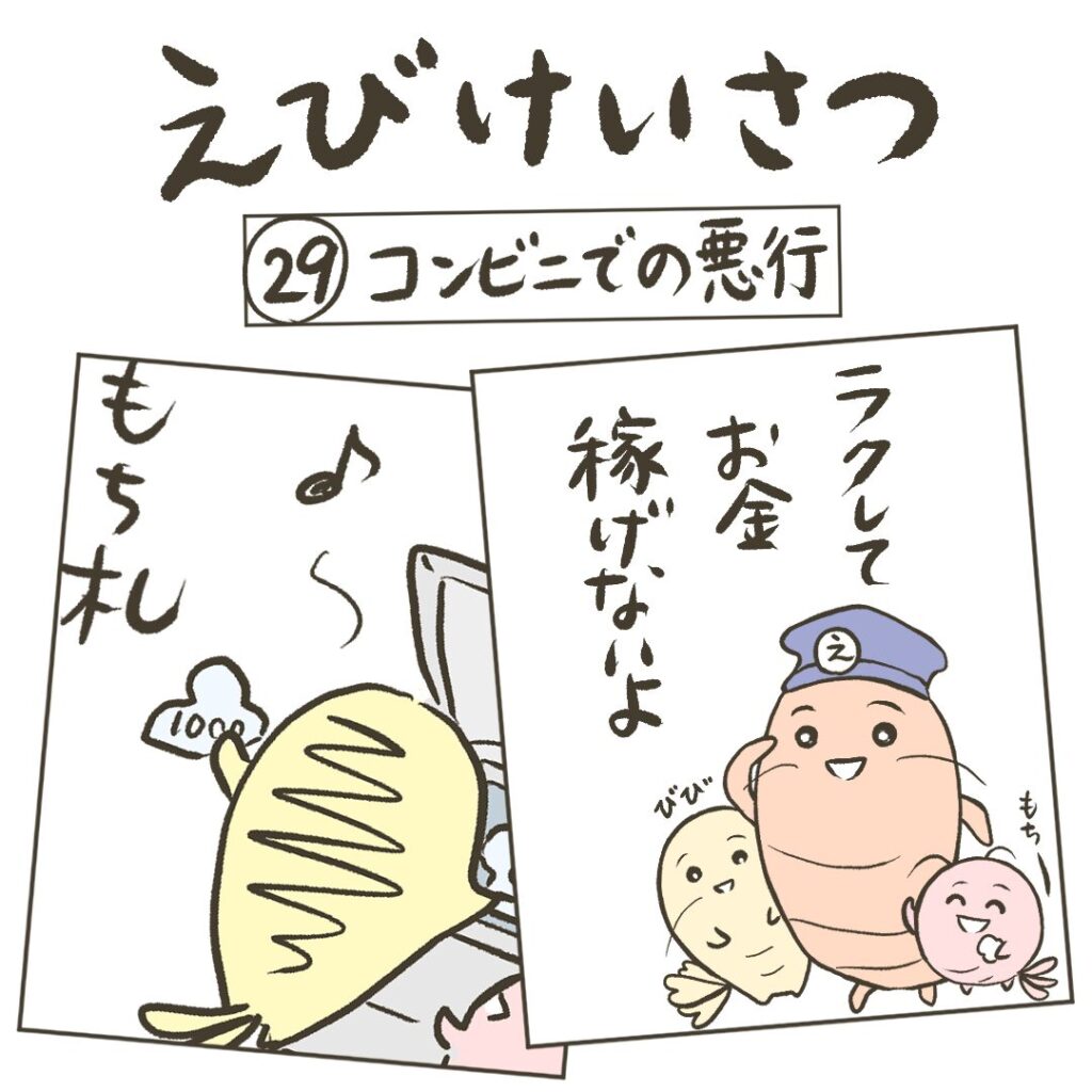 【まんが】第29話 コンビニでの悪行 まんが 2025.10.24 悪いこと思いついたわるえびちゃん。今日もえびけいさんが確保するよ。 同じストーリーの動画もあるよ。オリジナルピアノ曲とイラストに動きをつけた約1分の動画だよ↓【動画】第29話 コンビニでの悪行 次の話はこちら↓ 【まんが】第30話 乗りたい知りたい好奇心旺盛なえび登場。いろんなことに興味があるからつい乗っちゃったみたい。同じストーリーの動画もあるよ。オリジナルピアノ曲とイラストに動きをつけた約1分の動画だよ↓【動画】第30話 乗りたい知りたい次の話はこちら↓前回の話はこちら↓ 前回の話はこちら↓ 【まんが】第28話 きれいって罪だねきれいだから引き寄せられちゃうよね。だけど違うやり方もあったと思う。同じストーリーの動画もあるよ。オリジナルピアノ曲とイラストに動きをつけた約1分の動画だよ↓【動画】第28話 きれいって罪だね次の話はこちら↓前回の話はこちら↓