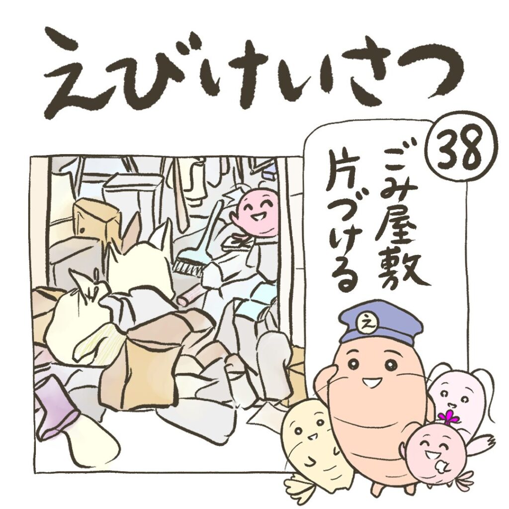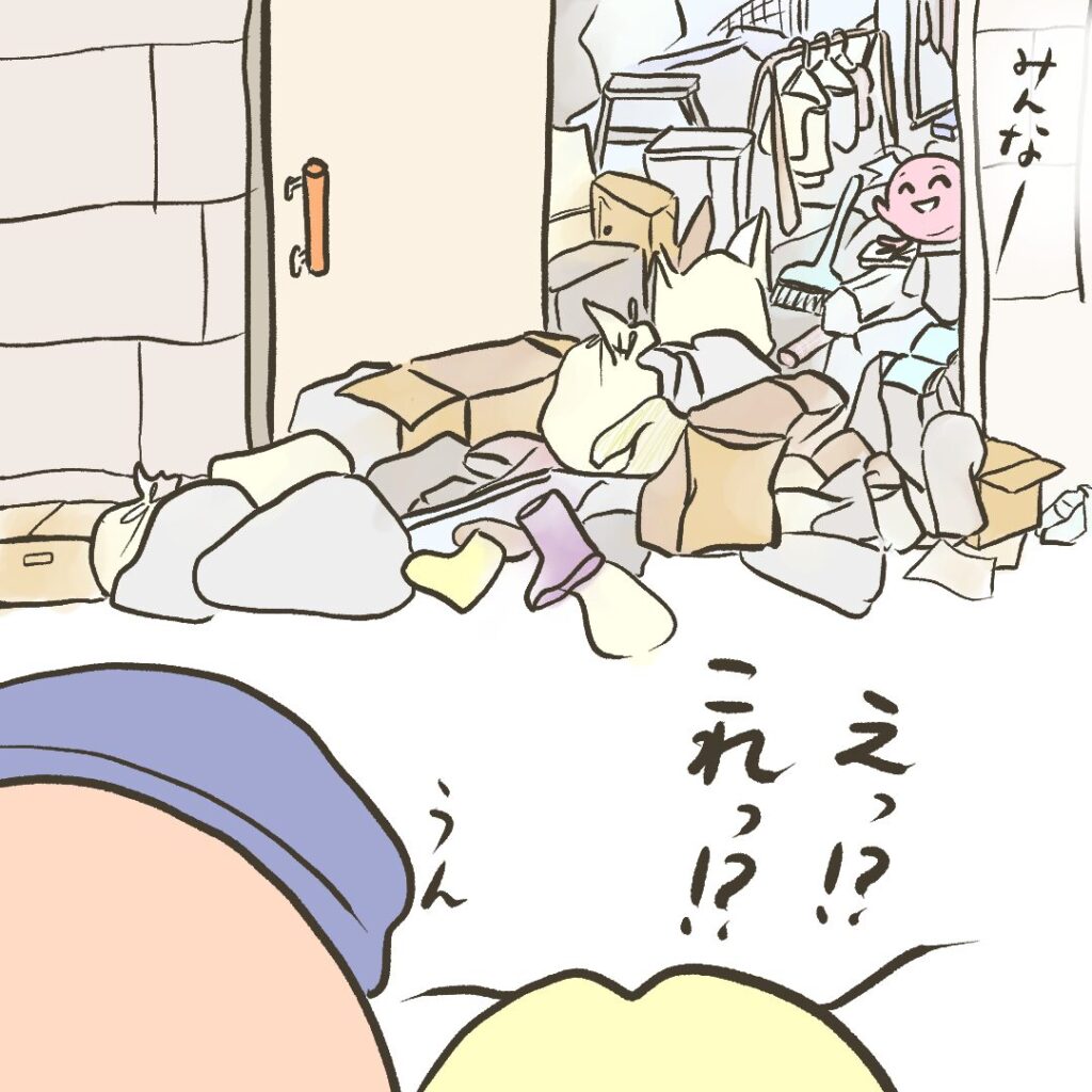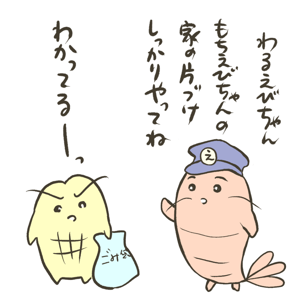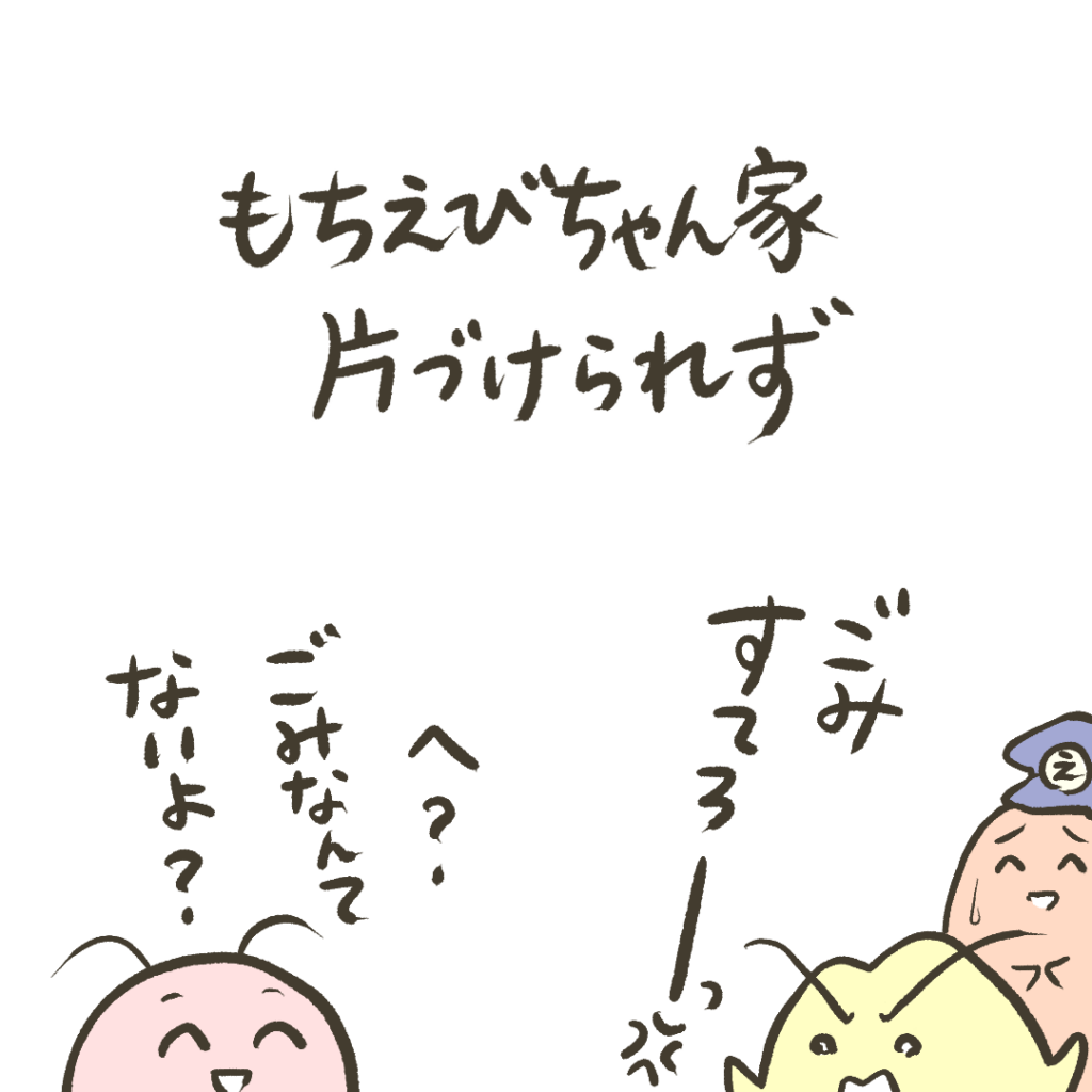 まんが「もちえびちゃん家を片づけるの刑」に処されたわるえびちゃん。荒れ放題のごみ屋敷かたづけられるかな?