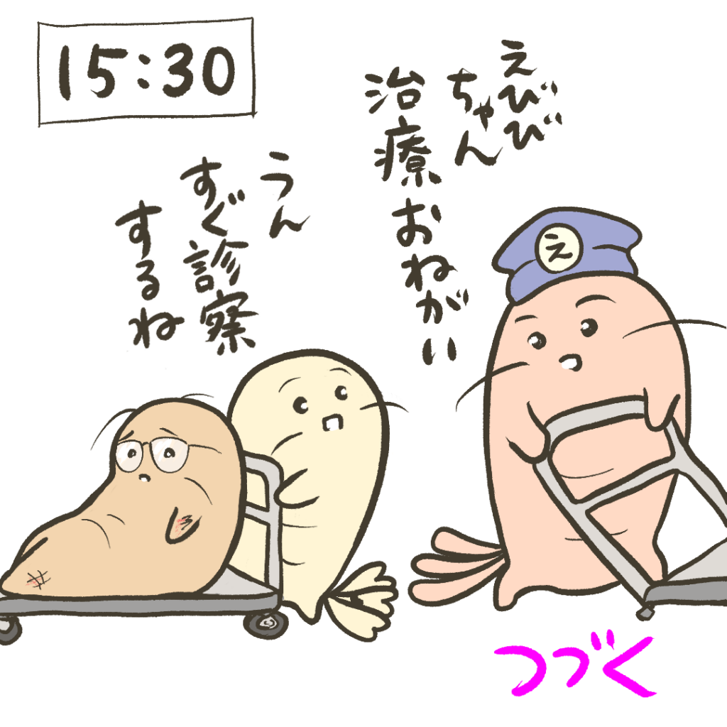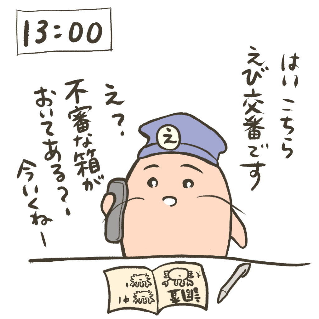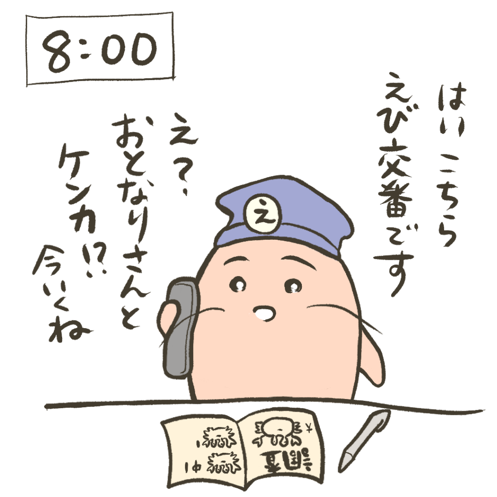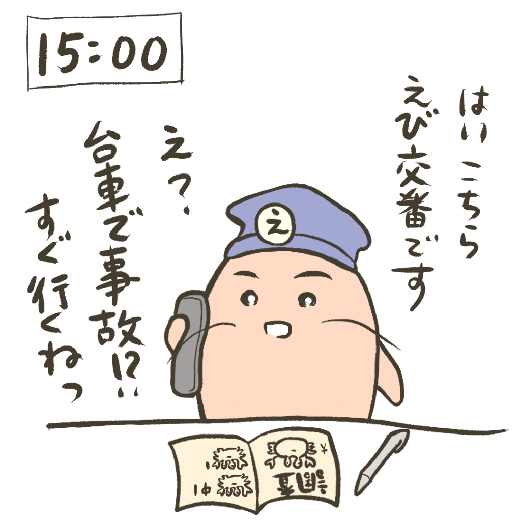えびけいさつの1日は大忙し。いろんな困りごとを解決するよ。